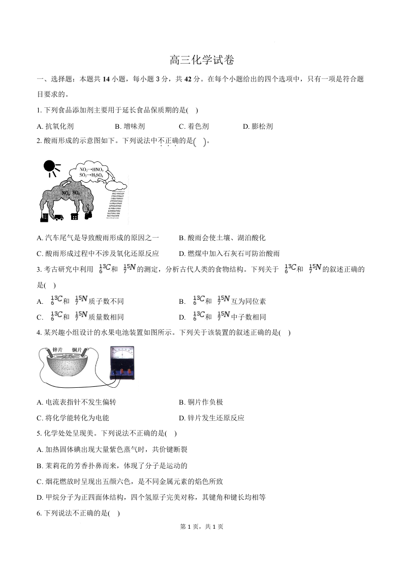 高三化学+答案--河北省沧州市十二校2026届高三上学期1月一模考试