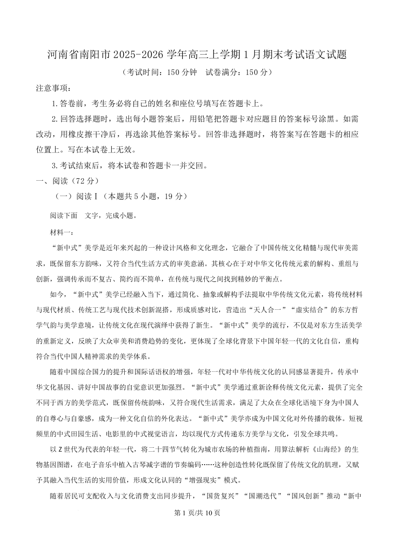 高三语文(原卷版)--河南省南阳市2026届高三上学期1月期终质量评估