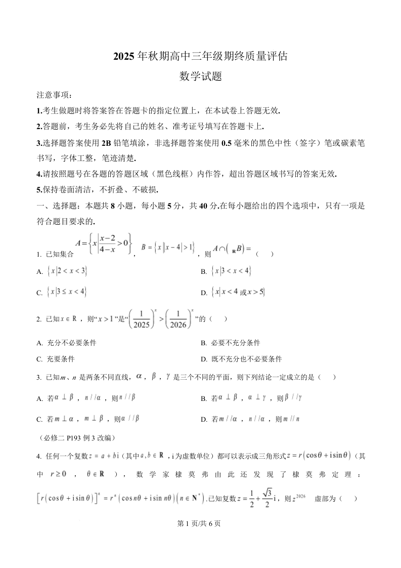 高三数学(原卷版)--河南省南阳市2026届高三上学期1月期终质量评估
