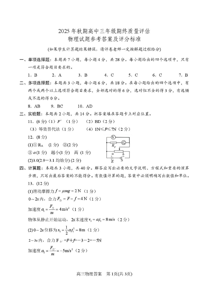 高三物理答案--河南省南阳市2026届高三上学期1月期终质量评估