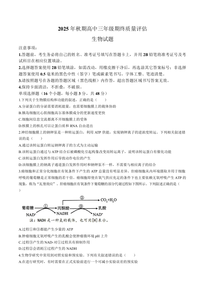 高三生物+答案--河南省南阳市2026届高三上学期1月期终质量评估