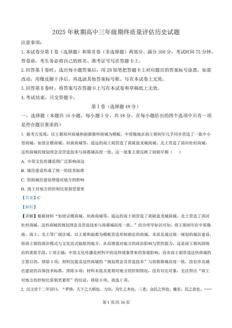 高三历史(精品解析版)--河南省南阳市2026届高三上学期1月期终质量评估