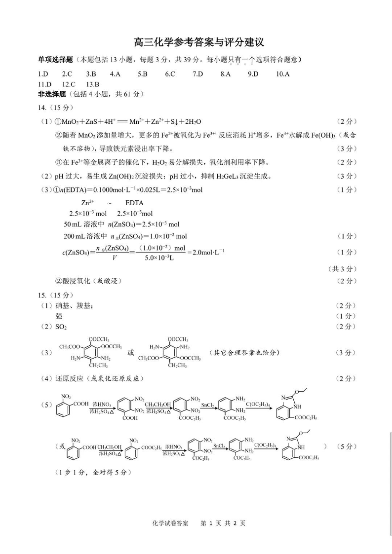 高三化学答案--江苏省扬州市2026届高三上学期1月期末考试(扬州一模)