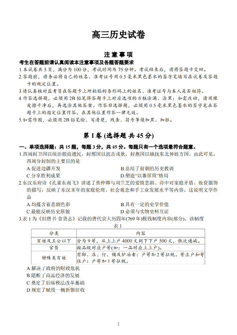 高三历史--江苏省扬州市2026届高三上学期1月期末考试(扬州一模)