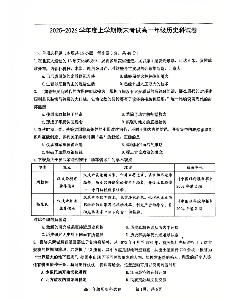 高一历史+答案--辽宁省五校协作体2025-2026高一1月联考期末