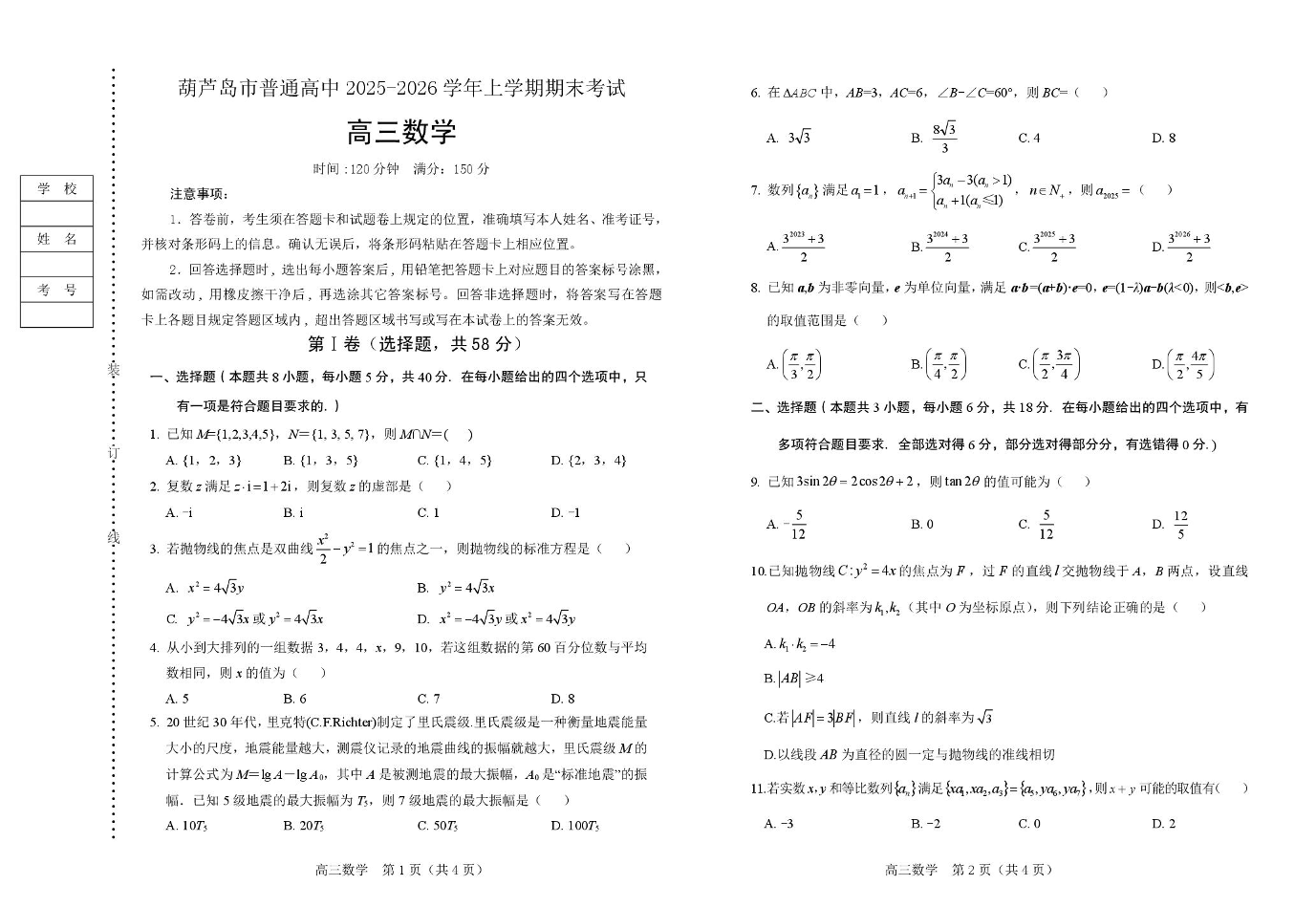 高三数学--辽宁省葫芦岛市2026届高三上学期1月期末考试
