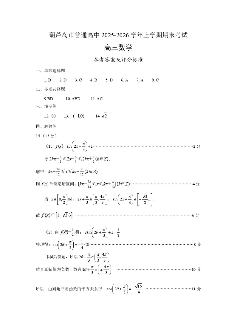高三数学答案--辽宁省葫芦岛市2026届高三上学期1月期末考试