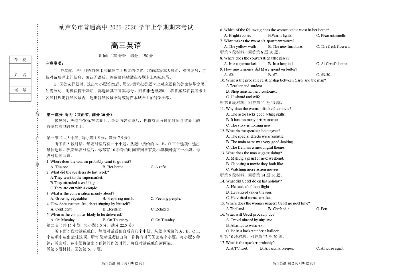 高三英语--辽宁省葫芦岛市2026届高三上学期1月期末考试