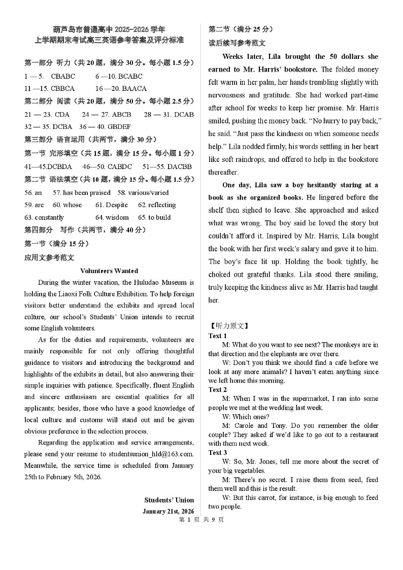 高三英语答案--辽宁省葫芦岛市2026届高三上学期1月期末考试