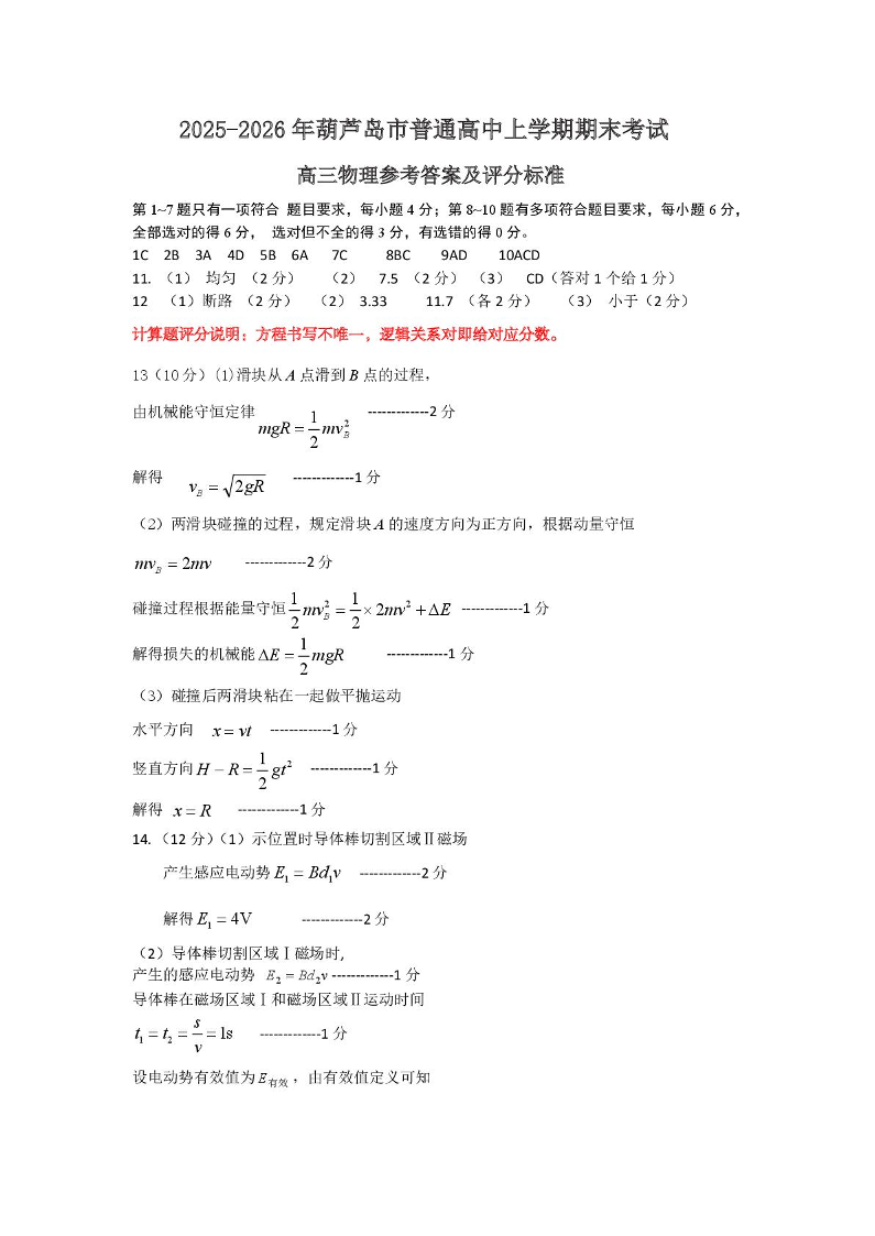 高三物理答案--辽宁省葫芦岛市2026届高三上学期1月期末考试