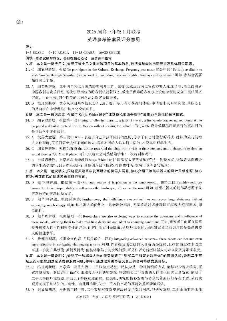 高三英语答案--百师联盟2026届高三九省联考1月期末考试