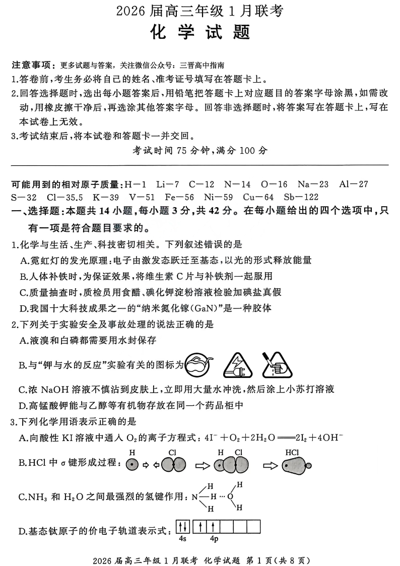 高三化学--百师联盟2026届高三九省联考1月期末考试