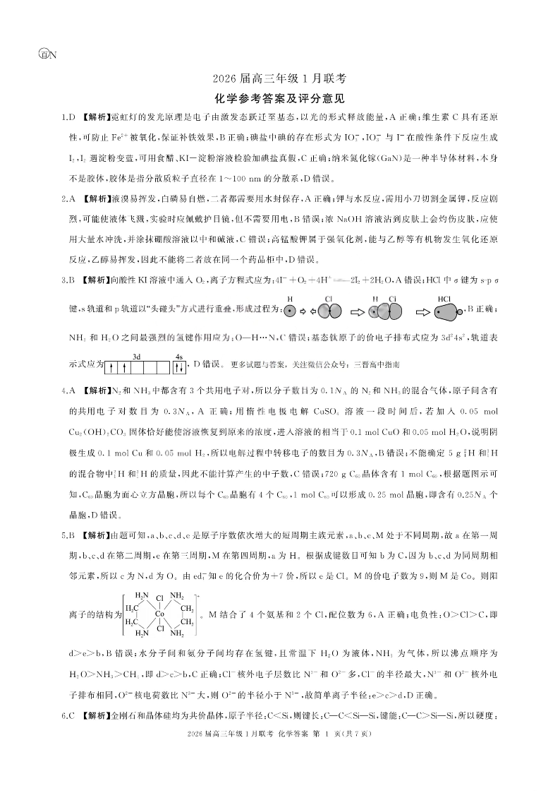 高三化学答案--百师联盟2026届高三九省联考1月期末考试