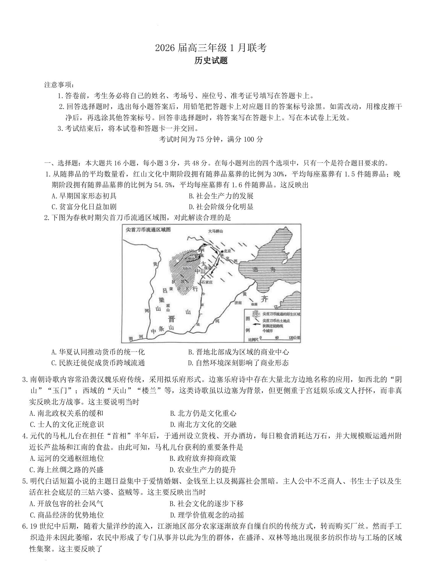高三历史--百师联盟2026届高三九省联考1月期末考试