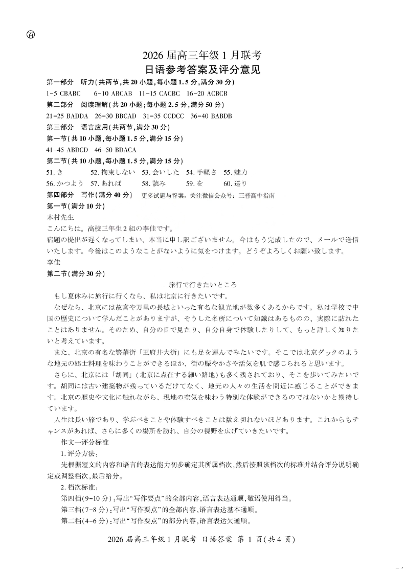 高三日语答案--百师联盟2026届高三九省联考1月期末考试