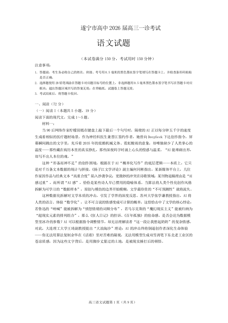 高三语文--四川省遂宁市2026届高三上学期一诊考试(遂宁一诊)