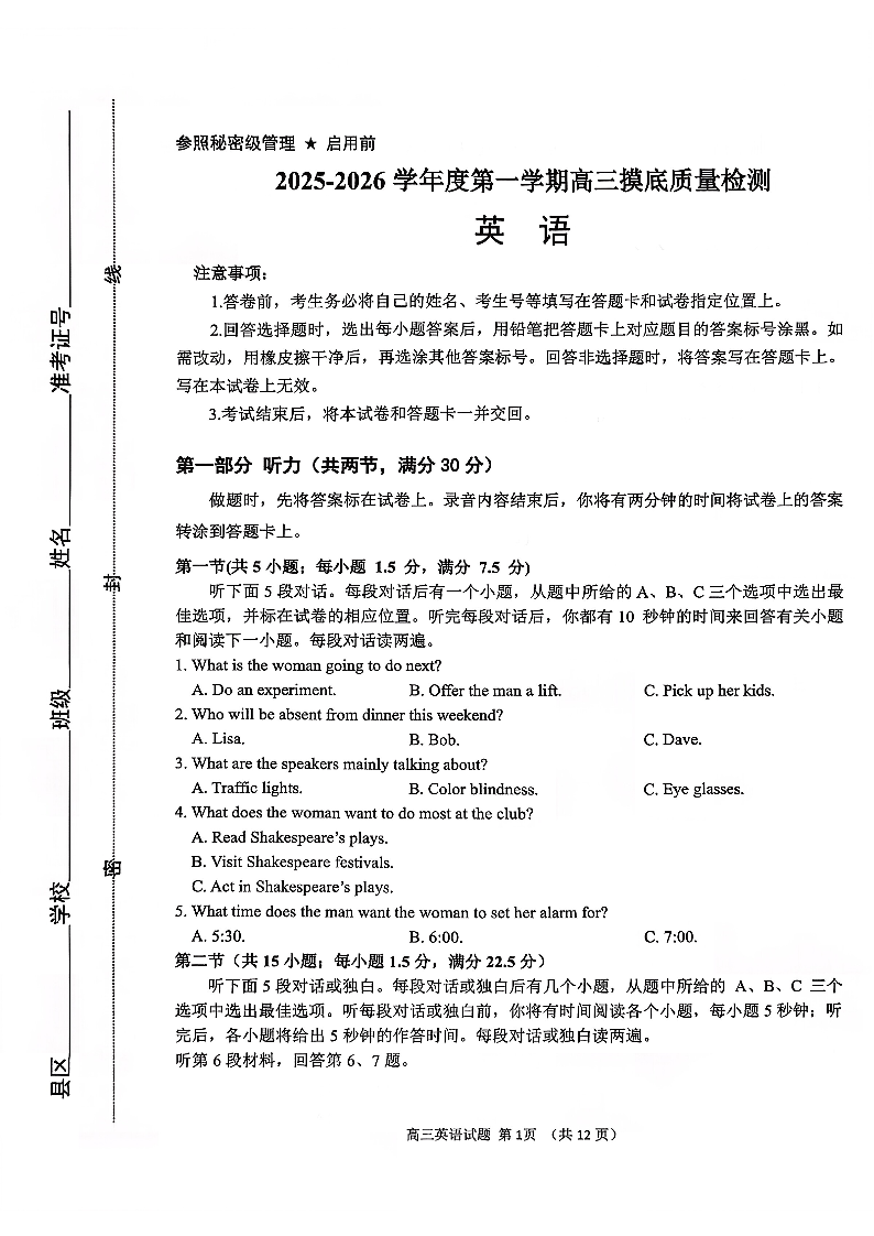 高三英语--2026届山东省淄博市第一学期高三摸底质量检测(期末)