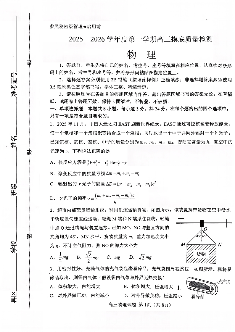 高三物理--2026届山东省淄博市第一学期高三摸底质量检测(期末)