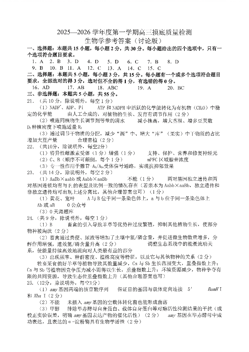 高三生物答案--2026届山东省淄博市第一学期高三摸底质量检测(期末)