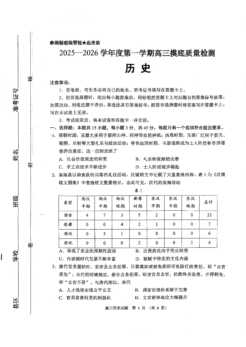高三历史--2026届山东省淄博市第一学期高三摸底质量检测(期末)