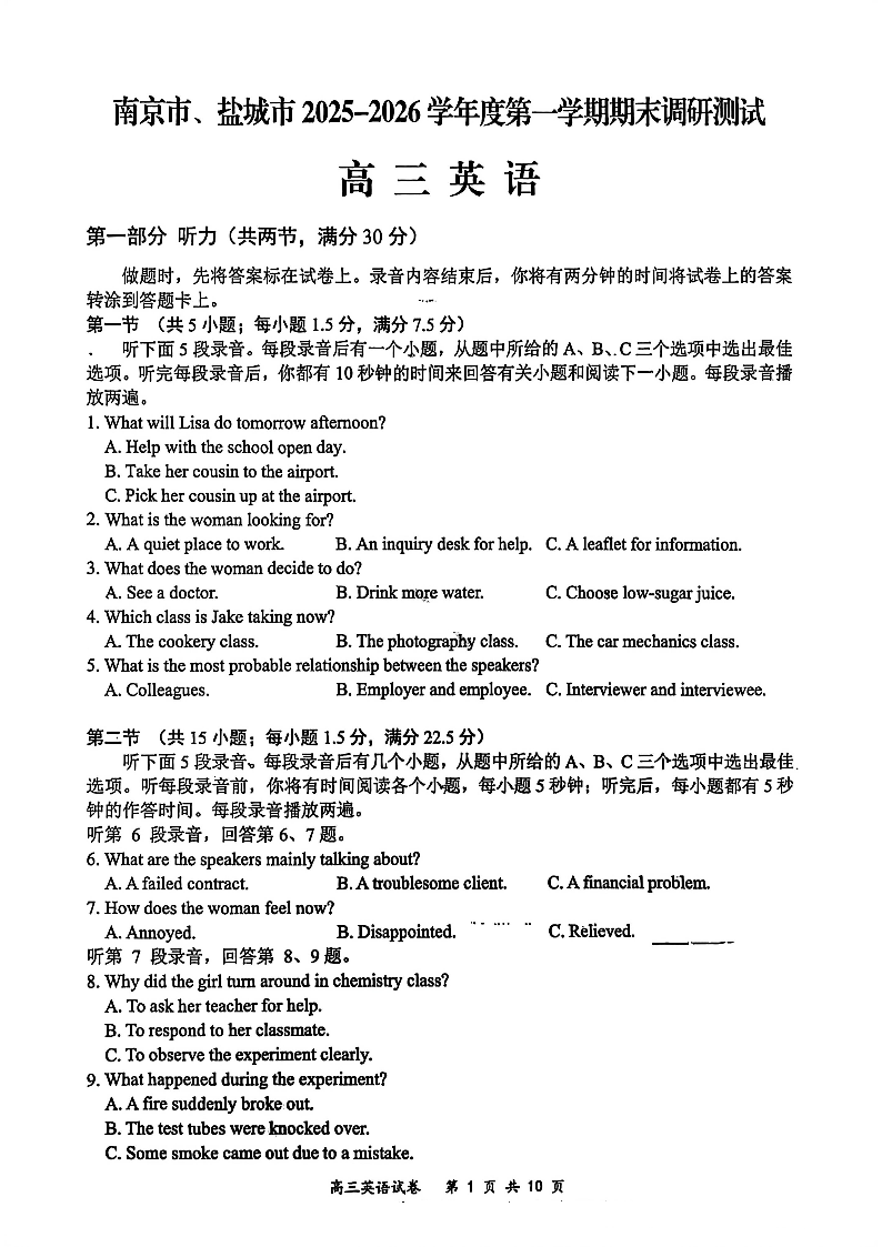 高三英语--江苏省盐城市、南京市2026届高三上学期1月期末调研测试 (南京盐城一模)