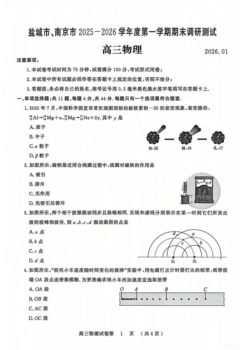 高三物理--江苏省盐城市、南京市2026届高三上学期1月期末调研测试 (南京盐城一模)