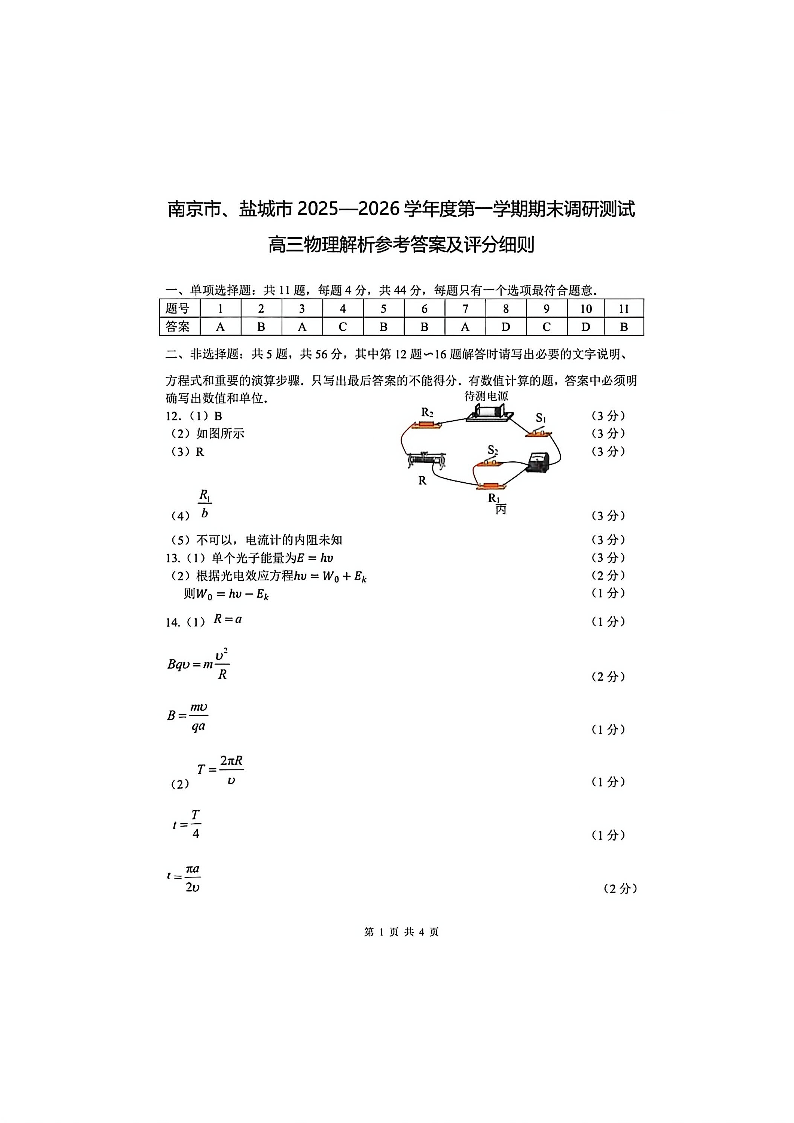 高三物理答案--江苏省盐城市、南京市2026届高三上学期1月期末调研测试 (南京盐城一模)