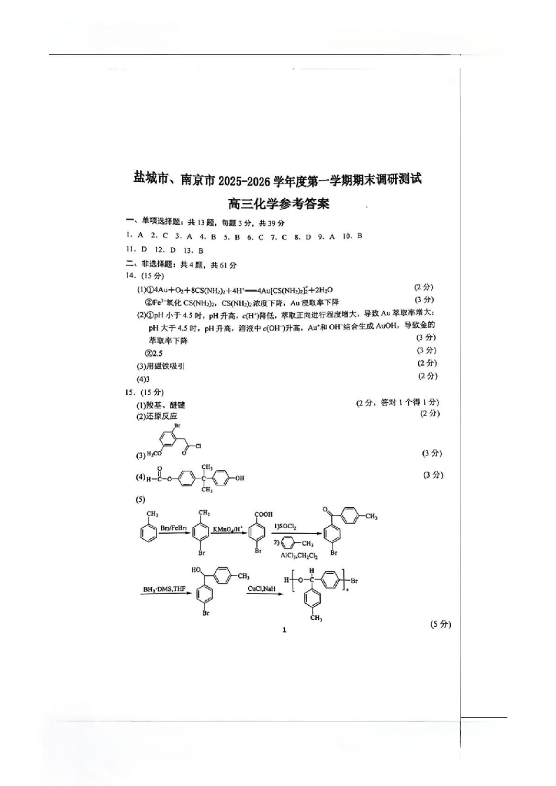 高三化学答案--江苏省盐城市、南京市2026届高三上学期1月期末调研测试 (南京盐城一模)