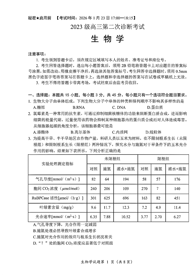 高三生物--四川省“元三维大联考”2023级高三第二次诊断考试(绵阳二诊B)