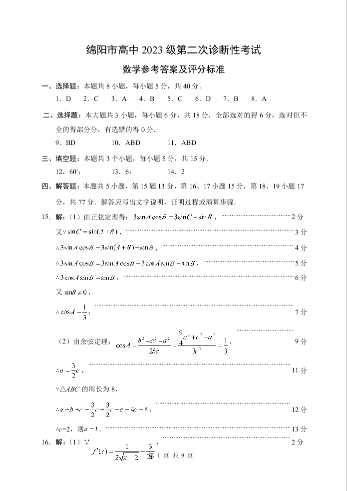 高三数学A答案--四川省绵阳市2026届高三上学期第二次诊断性考试(绵阳二诊)