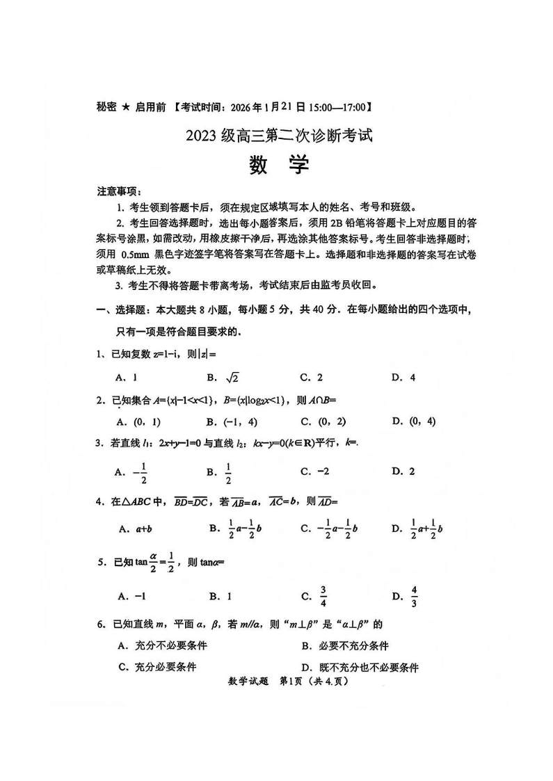 高三数学B--四川省绵阳市2026届高三上学期第二次诊断性考试(绵阳二诊)