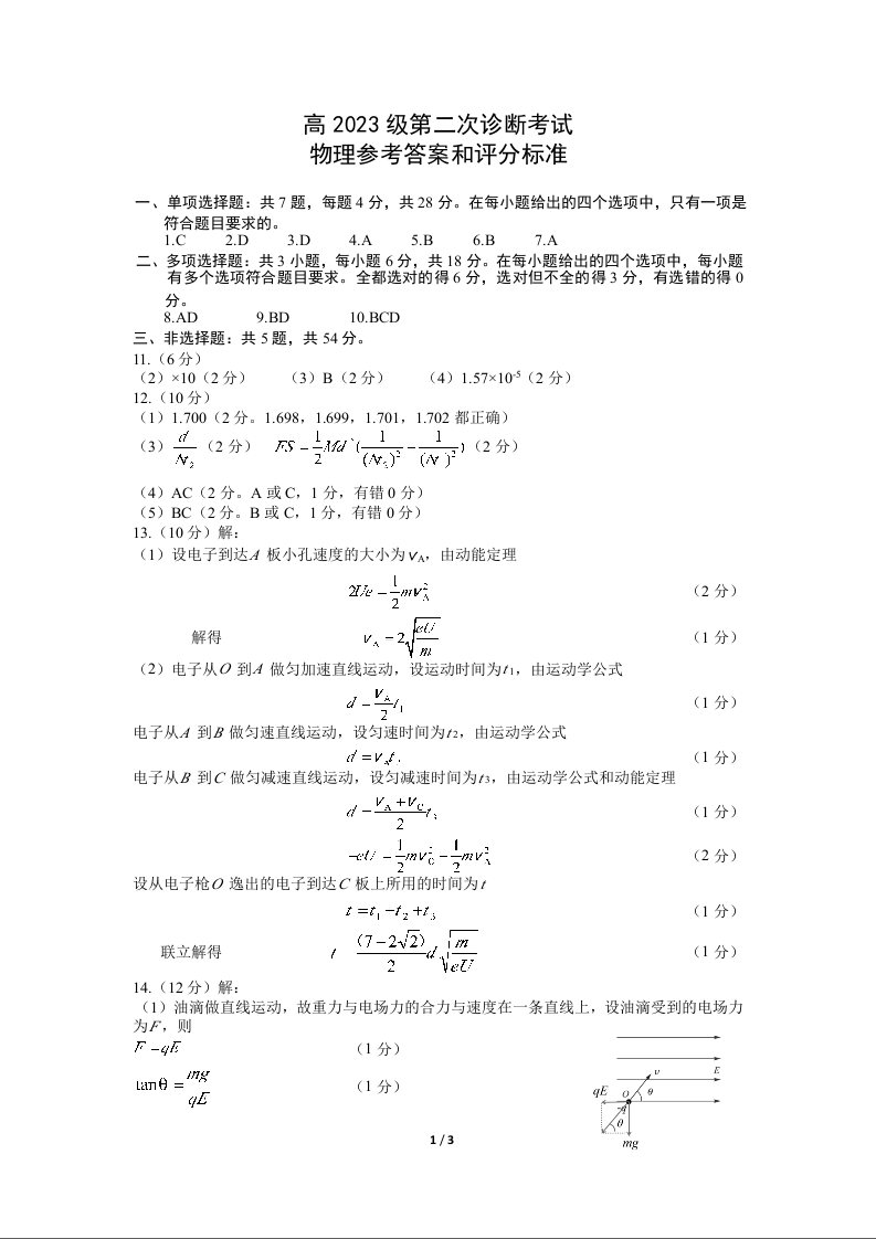 高三物理答案--四川省绵阳市2026届高三上学期第二次诊断性考试(绵阳二诊)