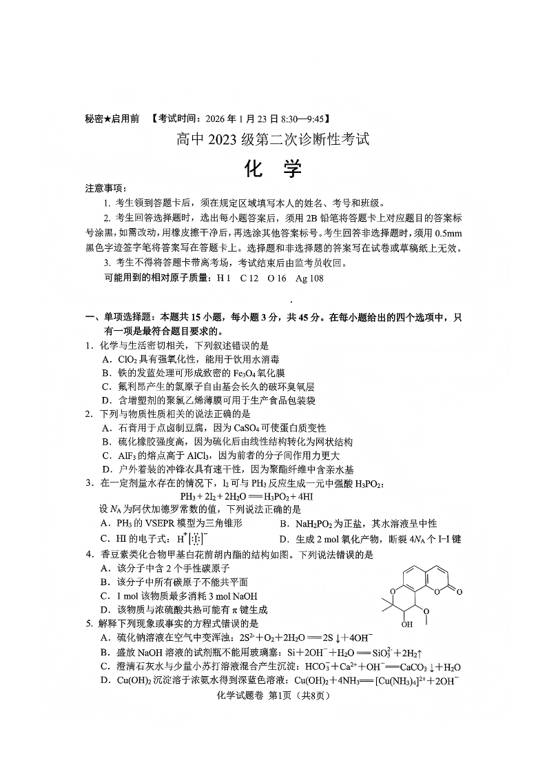高三化学--四川省绵阳市2026届高三上学期第二次诊断性考试(绵阳二诊)