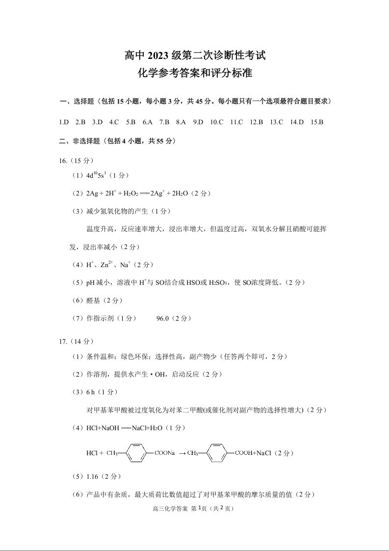 高三化学答案--四川省绵阳市2026届高三上学期第二次诊断性考试(绵阳二诊)