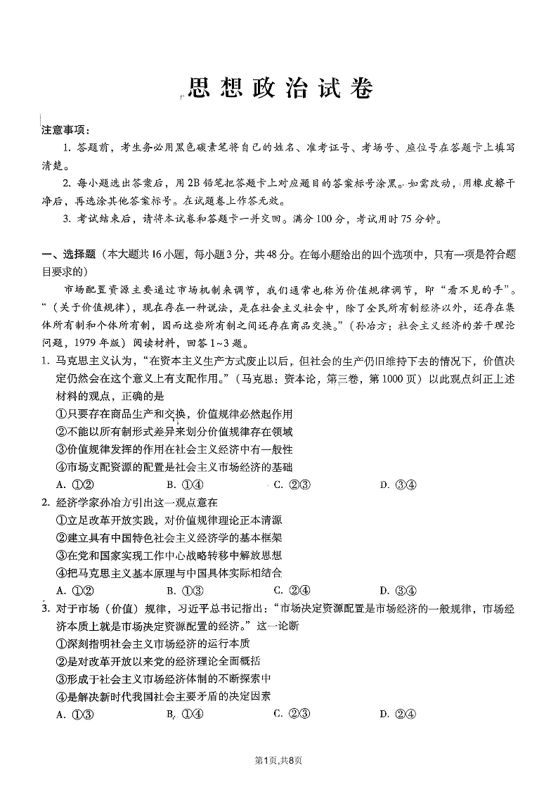 高三政治--重庆市巴蜀中学2026届高考适应性月考卷(六)