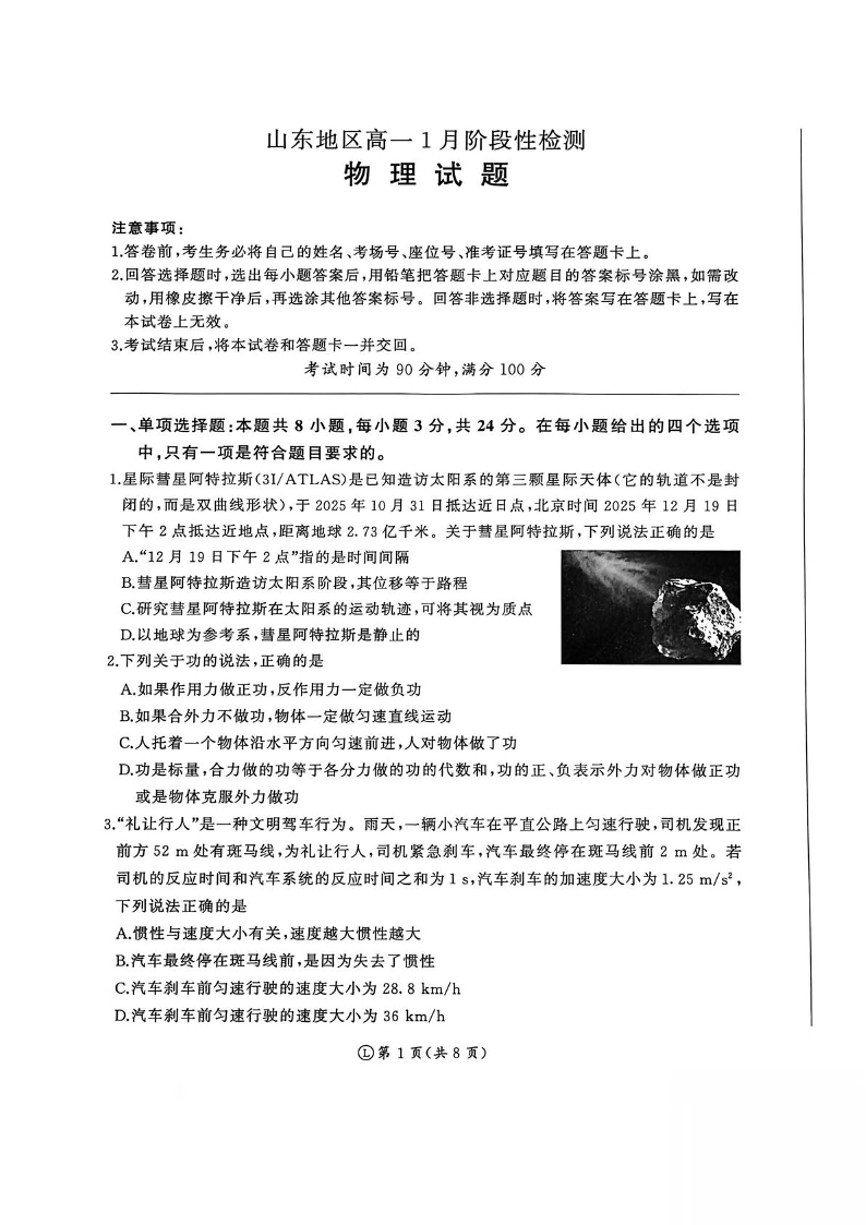高一物理+答案--山东省济南市名校联考2025-2026学年高一上学期1月月考
