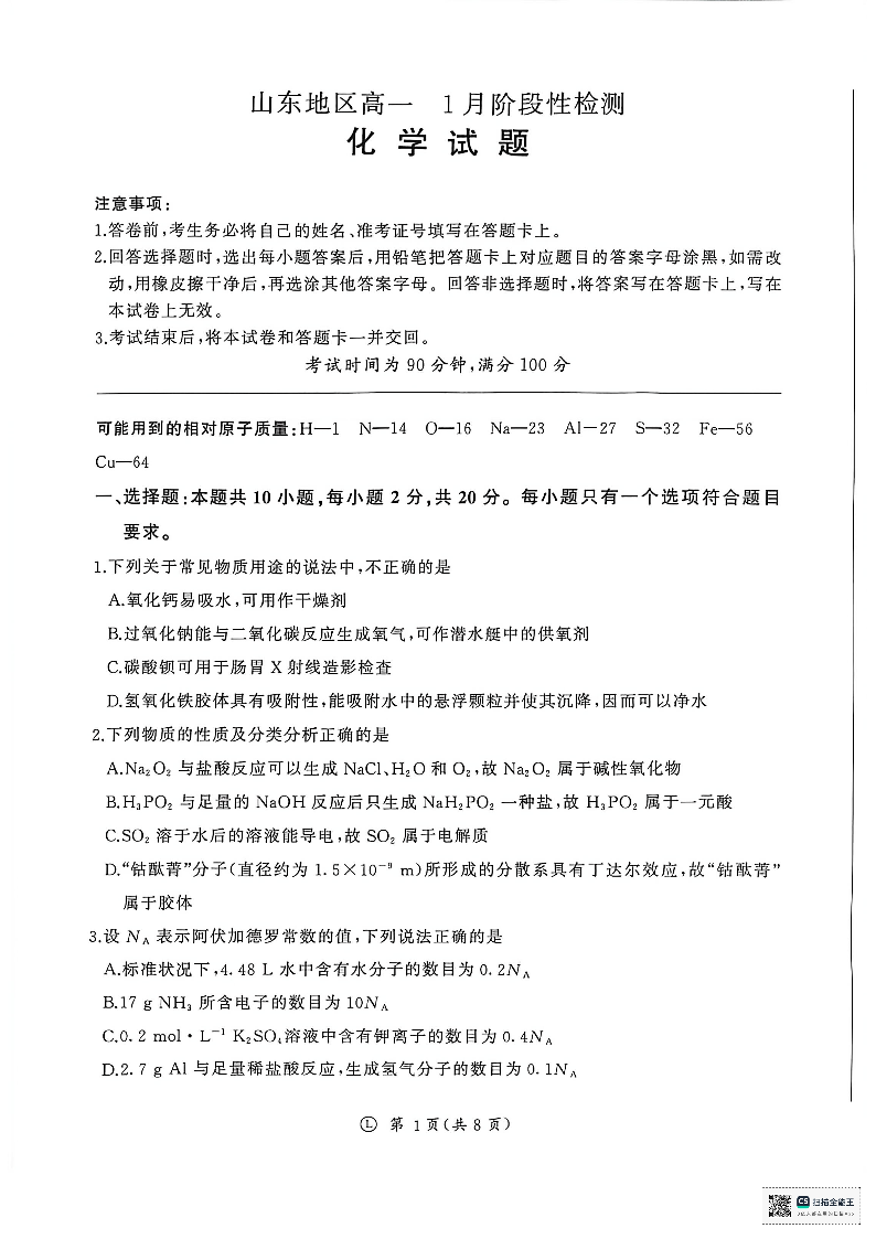 高一化学--山东省济南市名校联考2025-2026学年高一上学期1月月考