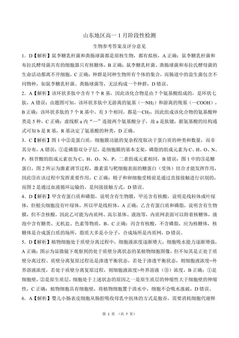 高一生物答案--山东省济南市名校联考2025-2026学年高一上学期1月月考