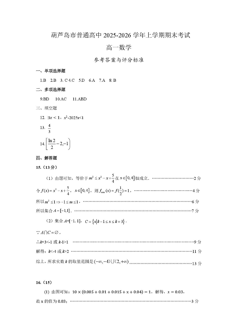 高一数学答案--辽宁省葫芦岛市2025-2026学年高一上学期1月期末