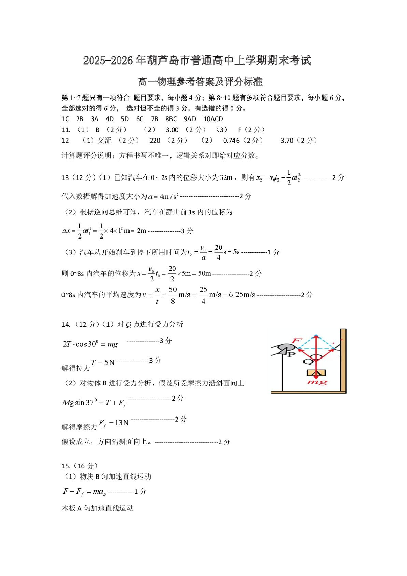 高一物理答案--辽宁省葫芦岛市2025-2026学年高一上学期1月期末