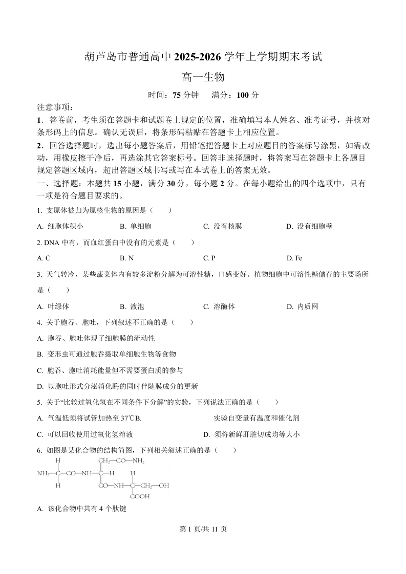 高一生物+答案--辽宁省葫芦岛市2025-2026学年高一上学期1月期末
