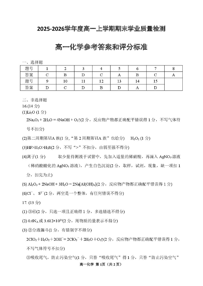 高一化学答案--吉林省延边朝鲜族自治州2025-2026学年高一上学期期末