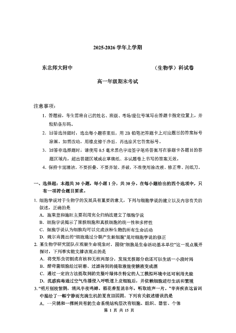 高一生物--吉林省长春市东北师大附中2025-2026学年高一上学期期末