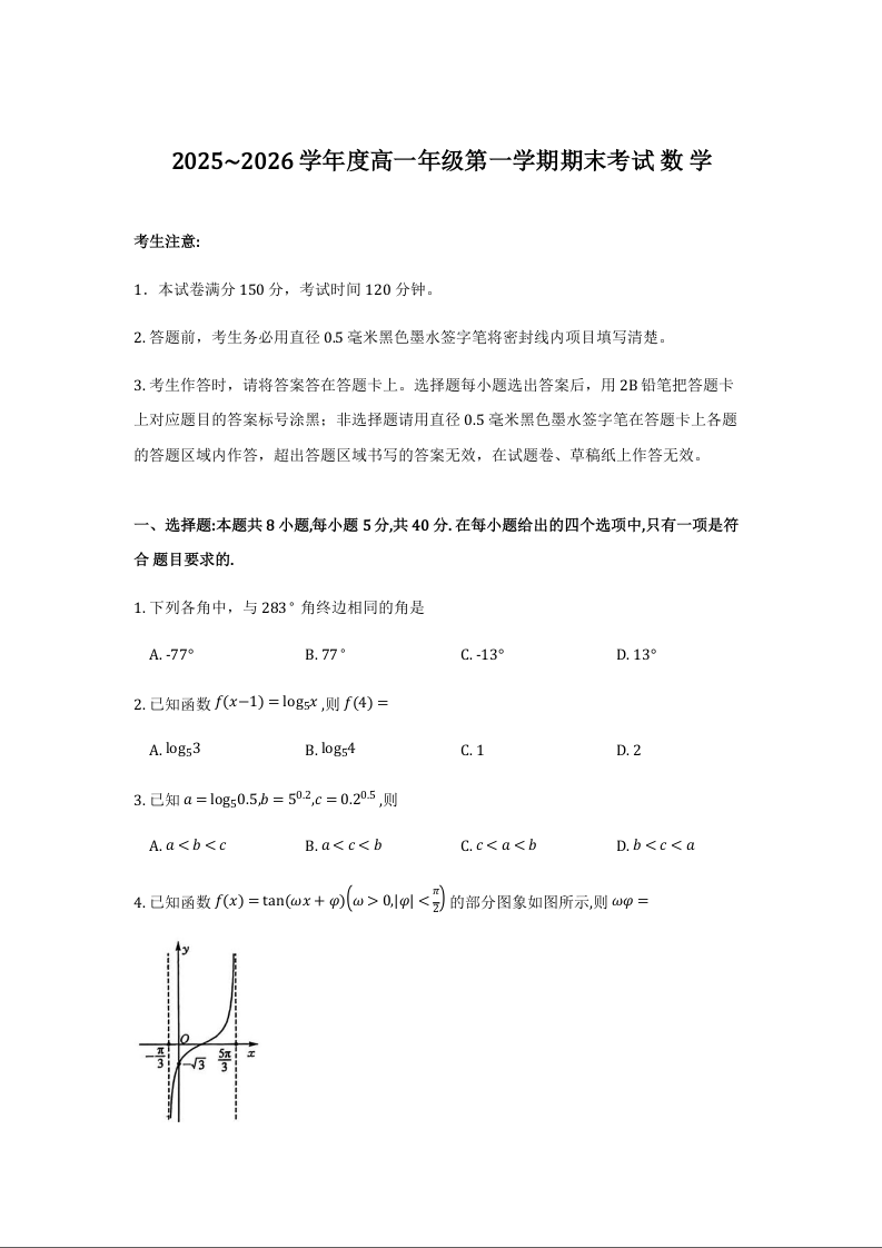 高一数学--黑龙江省龙东十校联盟2025-2026学年高一上学期期末考试