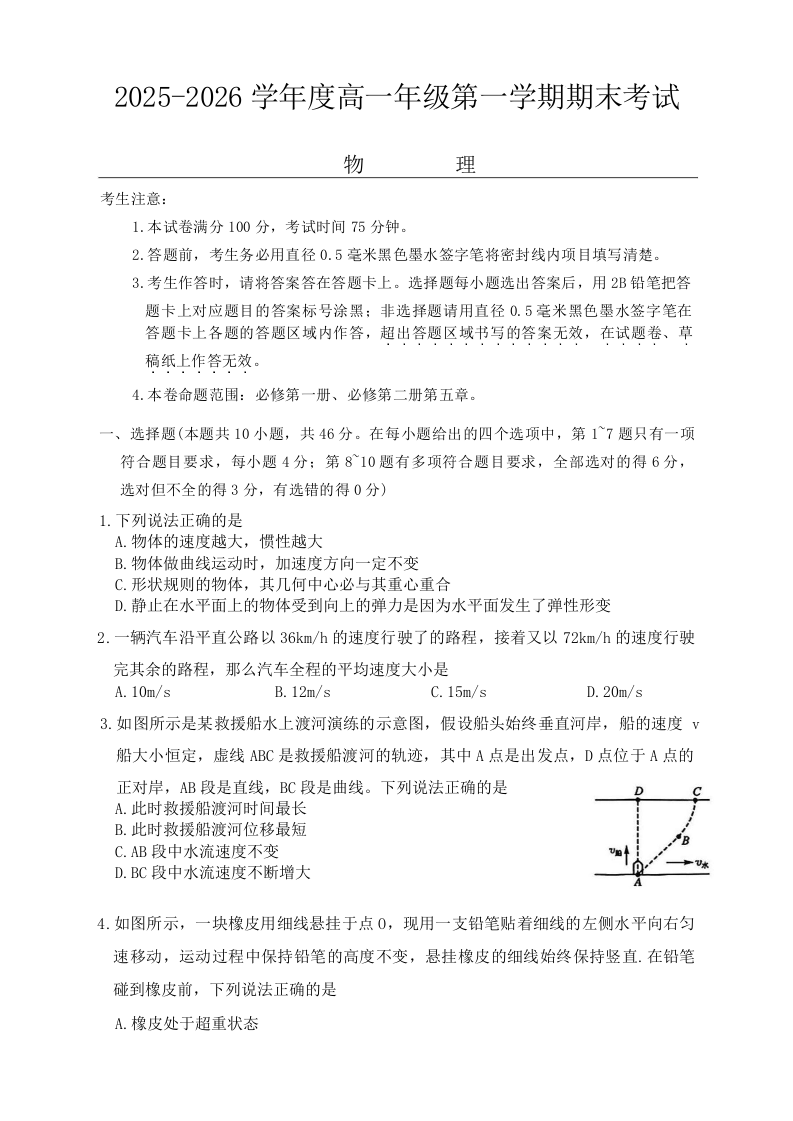 高一物理+答案--黑龙江省龙东十校联盟2025-2026学年高一上学期期末考试