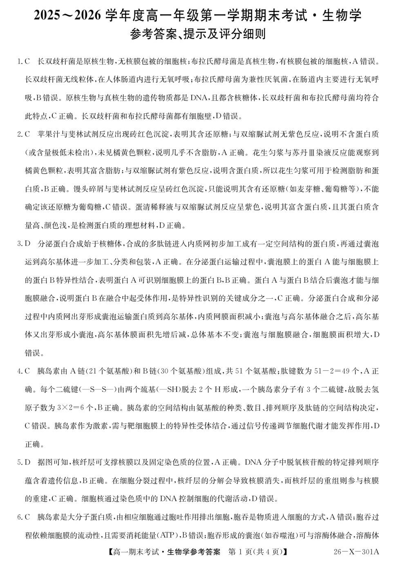 高一生物答案--黑龙江省龙东十校联盟2025-2026学年高一上学期期末考试