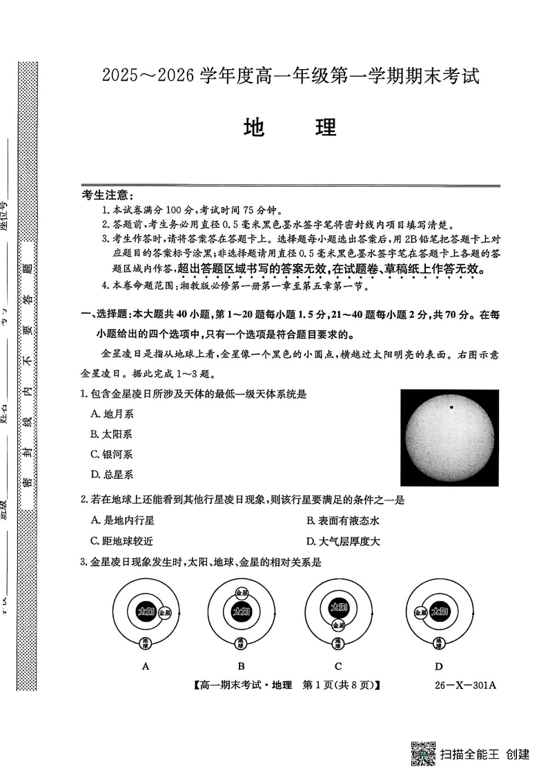 高一地理--黑龙江省龙东十校联盟2025-2026学年高一上学期期末考试
