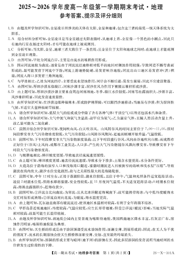 高一地理答案--黑龙江省龙东十校联盟2025-2026学年高一上学期期末考试