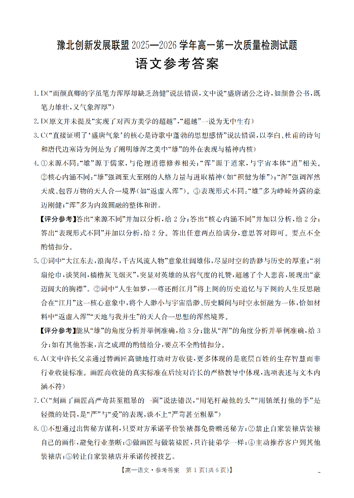 高一语文答案--河南省豫北创新发展联盟2025-2026学年高一上学期第一次质量检测试题