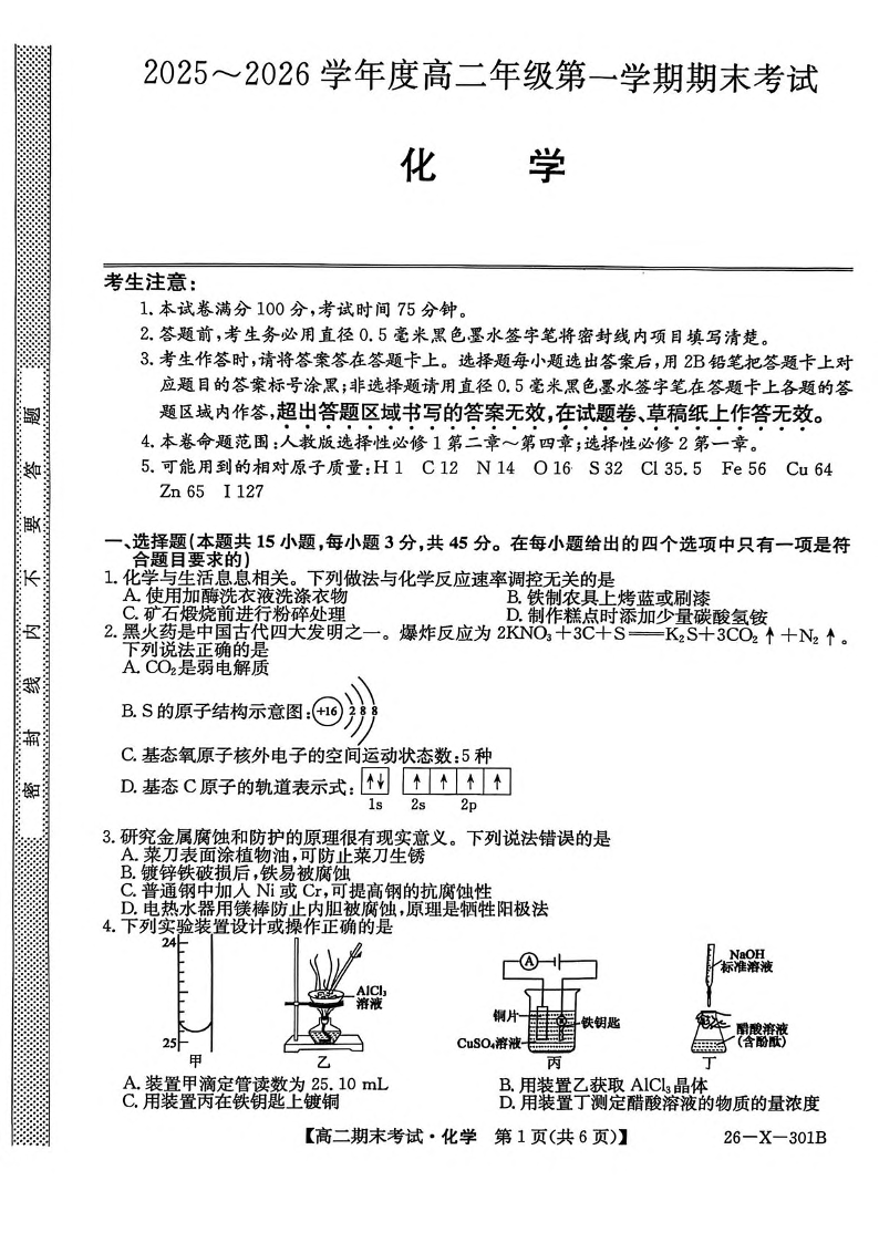 高二化学+答案--黑龙江省龙东十校联盟2025-2026学年高二上学期期末考试